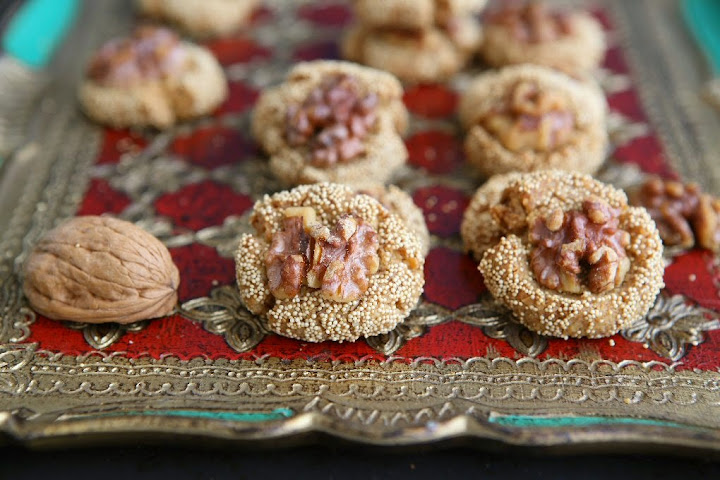 These healthy and nutritious whole grain cookies with walnuts and amaranth are easy to bring along and delicious to enjoy with a cup of tea. The trick with these cookies is to allow the dough to chill thoroughly and firm up, ideally overnight. If the dough balls become soft while you finish them with the walnut halves, chill the baking sheet with the cookies for 20 minutes before baking. Rolling them in amaranth seeds adds a wonderful crunch, but they are also delicious without.