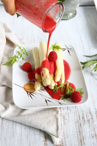 - In a large, deep skillet, add enough salted water to reach a depth of 2 inches. Bring it to a boil. Add in white asparagus and cook until crisp-tender, 2-3 minutes. Transfer to a bowl of ice water and let stand until chilled. Drain and pat dry. Arrange the asparagus, arugula and raspberries in a serving dish, drizzle with raspberry dressing.