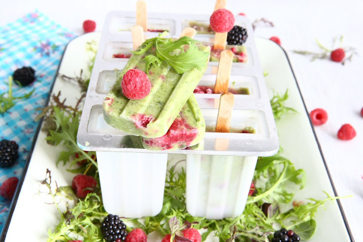Green smoothie in pop form! These frozen treats are a perfect healthy snack for summertime and a good fun way to get kids to “eat” their vegetables. If you ain't really into the leafy greens, simply use cucumber, celery or even parsley instead and mango and kiwi can be used in place of banana too.