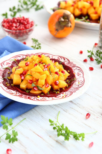 - Mix the diced persimmon, pomegranate seeds, minced garlic and baby greens. Top the beetroot with the fruit mixture.