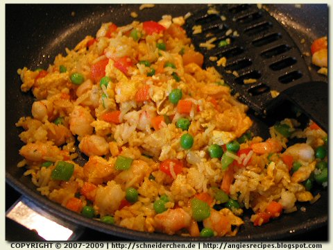 - Heat the skillet with some oil and, when it is very hot, add the cold cooked rice. Stir-fry until it is thoroughly heated through. Add in other ingredients and seasoning, stir-fry then toss in the spring onions. Stir and dish up.
