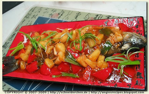 - Leave 1 tablespoon of frying oil in the pan and add in minced garlic and ginger root slices. Stir until fragrant and add in red pepper and prepared sauce. Stir well. Return the fish to pan, and add in pineapple chunks and spring onions. Cook for about 1-2 minutes and dish off.