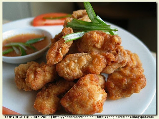 - Fill a large skillet with enough oil and heat until very hot. Coat the chicken dices with cornstarch and deep-fry until golden and crispy. Drain on paper towels.