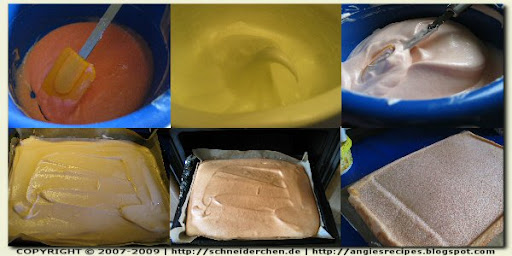 3. Fold the meringue in 3 additions with the yolk batter until incorporated and smooth. Pour the batter into the prepared baking tray and smooth the surface. Bake the cake on the upper rack in the oven for about 20 minutes. Remove the cake and sift some powdered sugar on the surface. Place a parchment paper on the top and then a baking sheet. Turn the tray upside down to unmold the cake. Remove the baking tray and peel away the lining paper. If you prefer to have golden side rolled in, then flip the cake or you can leave this step away. Trim the edges off and set aside, covered with a towel, to cool for about 10 minutes. Fill the cake with butter cream or jam and roll up. Store the cake in the fridge while preparing the tiger stripe.