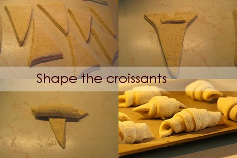 - Make a small slit in the base of each triangle, place a piece of dough trimming at the base. Starting at the base of the triangle, roll the dough up into a log. Tuck the tip the triangle under the body of the croissant. Bend in two corners to form the crescent shape.