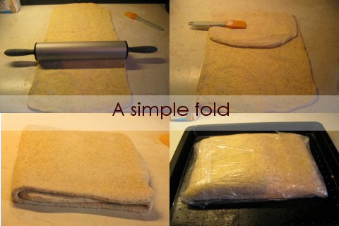 - With a heavy rolling pin, roll the dough into a rectangle, approximately 15x10 inch/38x25 cm. Fold the length of dough into thirds, as for a letter. Turn so that the open ends are at twelve and six o'clock. The first simple “fold” is completed. Wrap well in plastic and chill overnight.