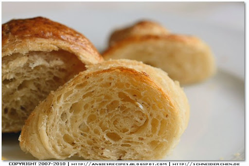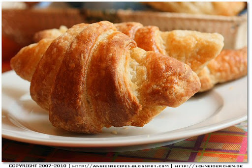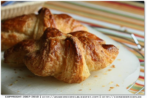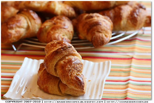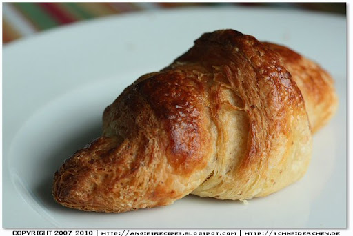 Tuesday, November 23, 2010Who doesn't love buttery and flaky croissants? They are rich, decadent and irresistible! According to Jeffrey Hamelman, when you know it's a good croissant after you take a bite and look at your shirt: if it’s covered with flakes of golden pastry that shatter from each bite, then it's a good one. It took me two days to make 16 croissants, and my husband finished 4 at one go in 20 minutes. So I strongly suggest you double the recipe!