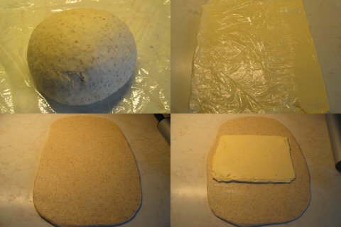 - Arrange dough with a short side nearest you. Put butter in center of dough so that long sides of butter are parallel to short sides of dough. Fold the bottom up over the butter, brushing off any excess flour, and then fold the top down over the butter to seal the butter.