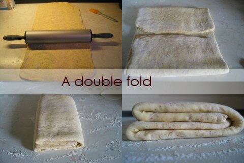 - Repeat the simple fold one more time. Wrap the dough tightly in plastic and chill 1 hour. Remove the dough from the refrigerator and place on the floured work surface. Unwrap and roll out to a rectangle, about 15x10 inch/38x25 cm. This time fold the top and bottom in so that they meet in the middle of the dough, then fold the dough in half again so that there are four layers of dough. Chill the dough, wrapped with plastic, in the fridge for 2 hours. Repeat the double fold once more. This is the final fold before rolled out and cut into croissants.