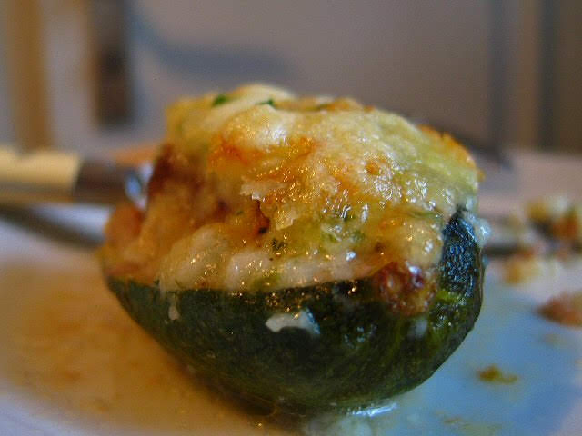 - In a mixing bowl, combine together the chopped zucchini, diced onion, ground meat, egg and bread crumbs. Season the mixture with salt and pepper. Fill the zucchini shells with the ground meat mixture.