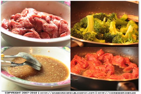 - Cut the beef across the grain into thin slices. Add in marinade and set aside for 20 minutes. Combine the ingredients of sauce in a bowl and set aside. Wash and drain the broccoli florets.