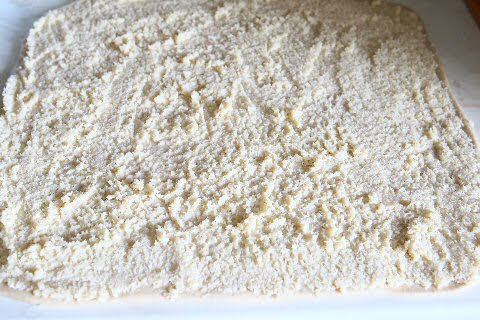 - Lightly flour a work surface and roll the dough into a 45x50 cm rectangle. Spread the prepared coconut filling over the top of the dough.