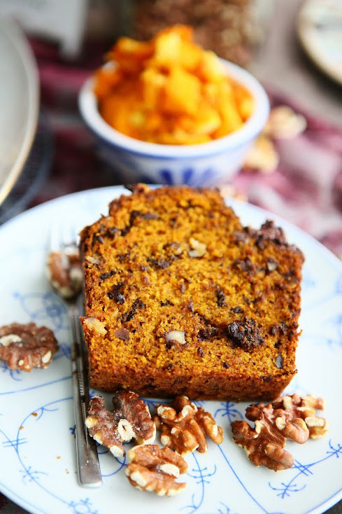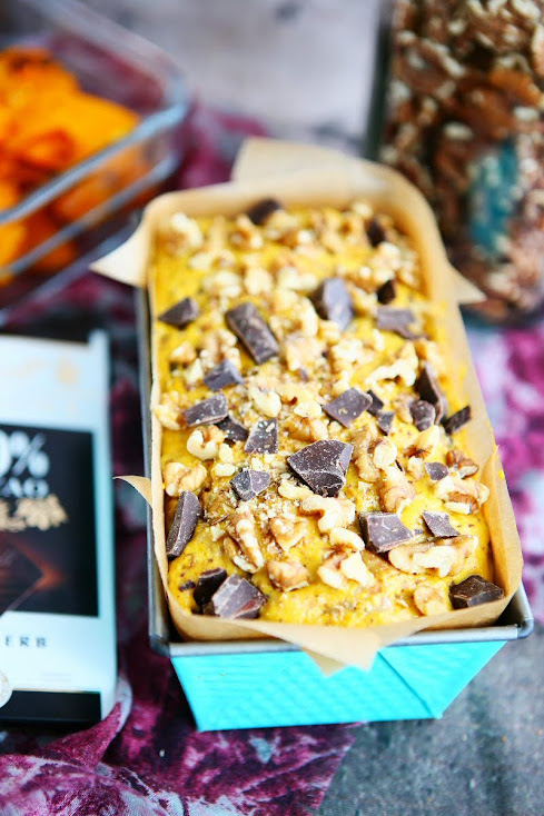 This spiced quick bread is filled with the ever-popular pumpkin flavour, warm spices, Lindt dark chocolate and walnuts, and it tastes absolutely amazing. You can always go with other nuts (pecans and hazelnuts are great) and chocolate. It's delightful as an afternoon pick-me-up treat or spread with some butter and a cup of coffee in the morning.